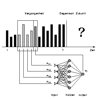 Zur Prognose einer Zeitreihe mit einem MLP wird ein gleitendes Zeitfenster mit n Vergangenheitswerten über die Zeitreihe gelegt. Die Trainingsaufgabe besteht darin, aus n Werten in der Input-Schicht auf den nächsten Wert zu schließen. Das Training erfolgt anhand der bekannten Werte. Das trainierte Netz wird zur Prognose eingesetzt, indem die letzten n bekannten Werte in der Input-Schicht angelegt werden, die das Netz auf den Prognosewert abbildet (s. Abbildung 4).