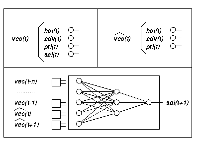 Als Inputvektor des MLP werden die bekannten Daten aus einem Zeitfenster von n Wochen, vect-n bis vect-1, verwandt sowie die Einflußfaktoren für die Wochen t und t+1. Das MLP wird darauf trainiert, diesen Input auf den normierten Wert des Abverkaufs, salt+1, abzubilden. Die Abbildung 6 stellt Input und Output schematisch dar.
