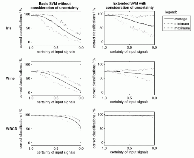 By using the trust signals to represent the uncertainty of input signals, one can increase the classification robustness. This is shown on the picture above which compares the performance of a support vector machine on three benchmark datasets of the UCI Machine Learning Repository with and without exploiting the trust signals for decreasing certainty, i. e. increasing noise level (0 to 100%).